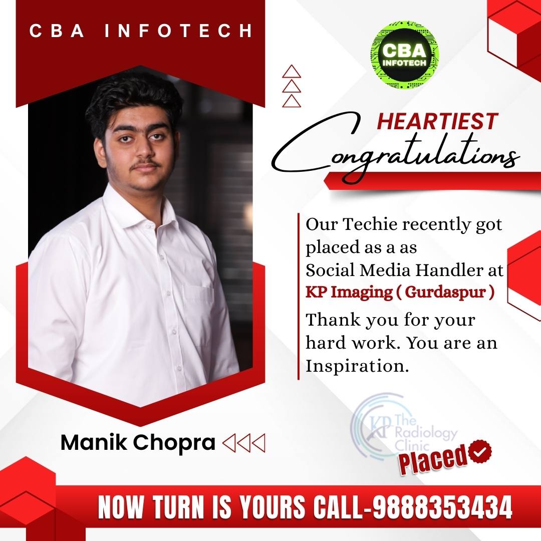 At CBA Infotech Gurdaspur, we are thrilled to announce yet another proud moment — one of our dedicated and skilled students has been successfully placed in a leading Multinational Company (MNC). This achievement stands as a shining example of our commitment to quality education, practical learning, and career-focused training.