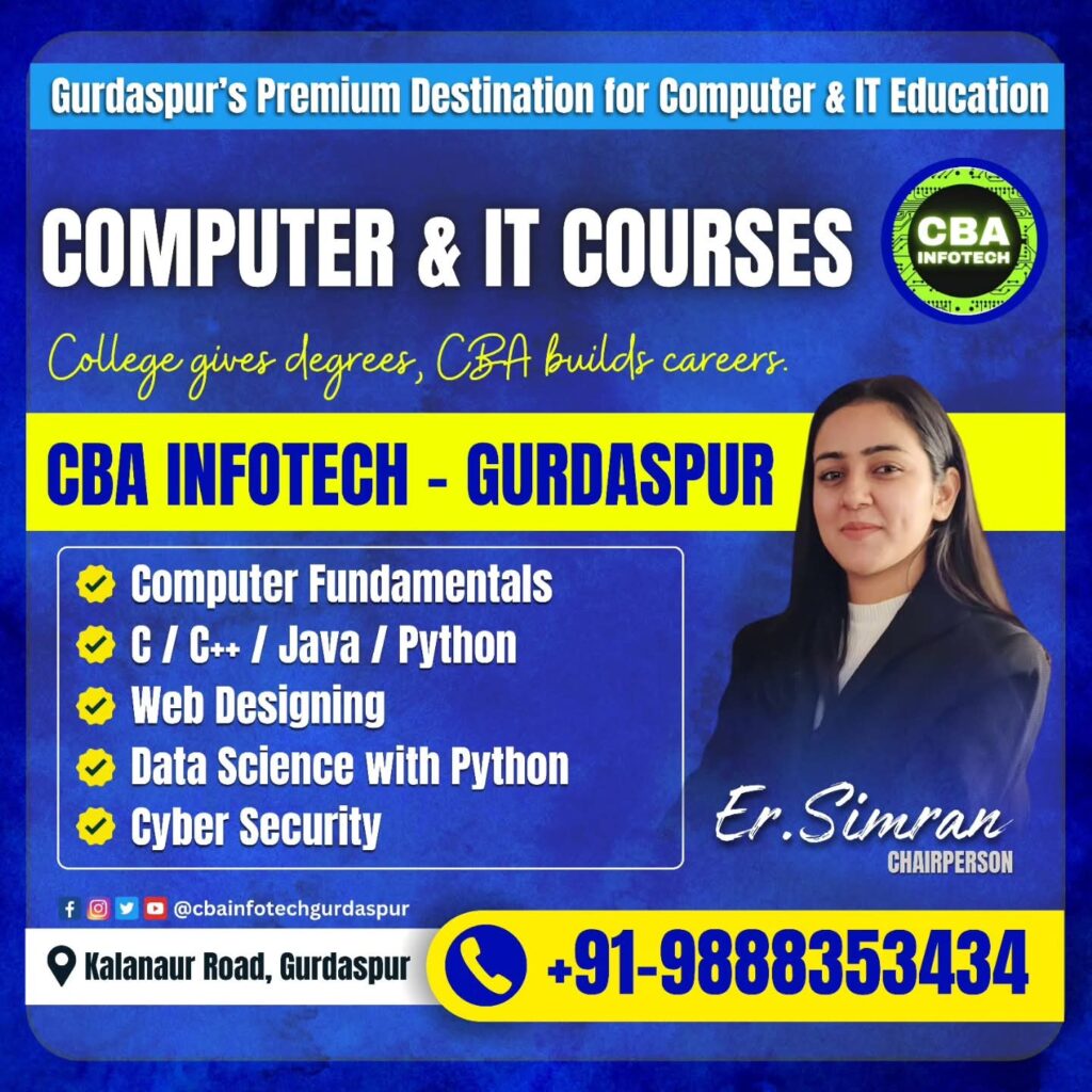 If you are serious about building a successful career in the IT field, then CBA Infotech Gurdaspur is the right choice for you. With expert trainers, practical learning, and career support, you can master skills in programming, web designing, data science, and cyber security.