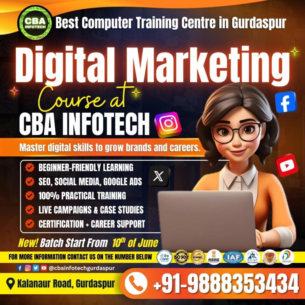 Digital Marketing has become one of the most in-demand career paths, offering opportunities across industries such as IT, healthcare, retail, education, and e-commerce. If you live in Punjab and are searching for the best Digital Marketing course in Gurdaspur, then CBA Infotech is the right choice for you.