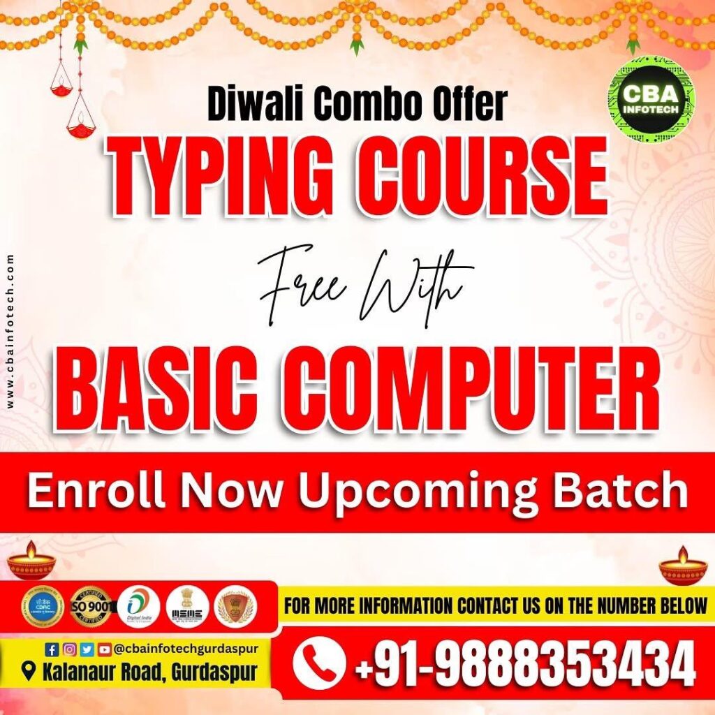 This Diwali join us at CBA INFOTECH for a better future and get typing course free with BASIC COMPUTER COURSE. Learn to type and increase your typing speed free of cost Unlock the potential with two essential skills for a digital age.our course combines fast,accurate typing with fundamental computer knowledge giving you a bright future.