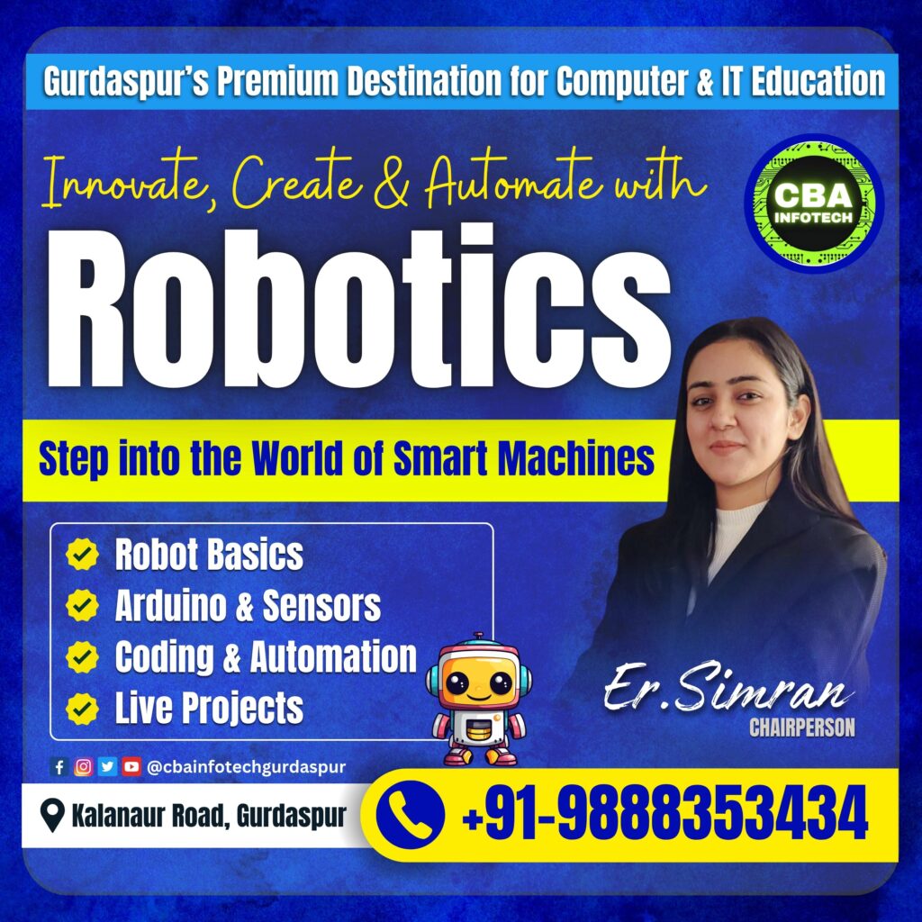 Robotics is shaping careers across fields like manufacturing, healthcare, agriculture, artificial intelligence, and automation. Learning robotics opens the door to global opportunities, research projects, and high-demand jobs.The world is entering an era where machines and humans work side by side to solve problems, save time, and increase efficiency. Robotics is no longer just a futuristic idea—it’s a reality shaping industries like healthcare, manufacturing, agriculture, logistics, and even education. At CBA Infotech Gurdaspur, we believe in empowering students with the skills to innovate, create, and automate using robotics and artificial intelligence.