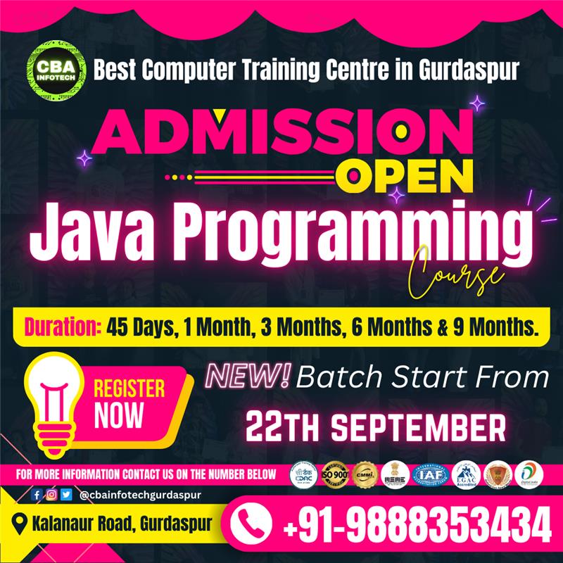 CBA Infotech, the Best Computer Training Centre in Gurdaspur, is excited to announce admissions open for the Java Programming Course. Whether you are a student, IT fresher, or working professional, this course is designed to help you master Java programming and prepare for real-world projects.