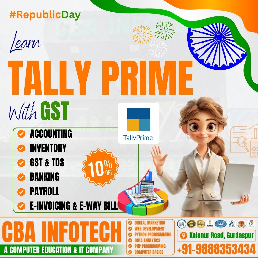To celebrate Republic Day, CBA Infotech is offering a special 10% discount on the Tally Prime with GST course. This is the perfect opportunity to upgrade your skills at an affordable cost and invest in a secure career.